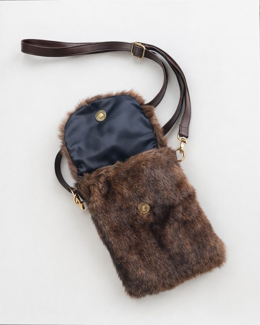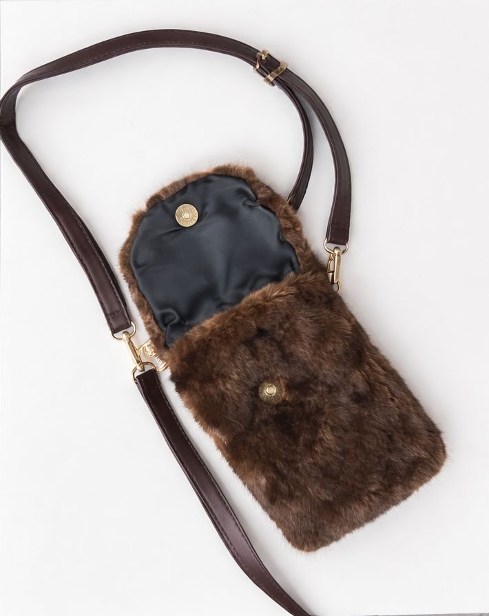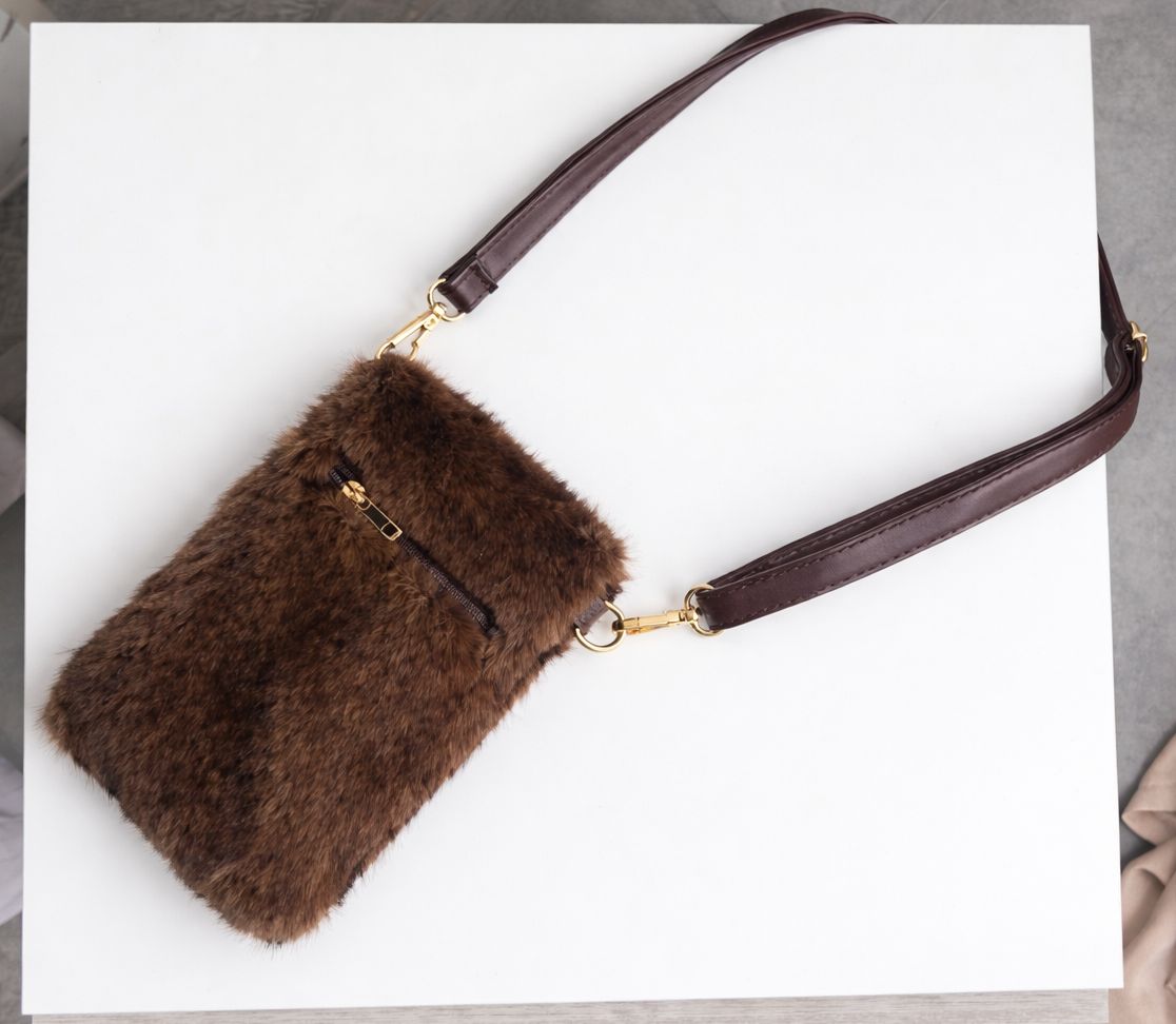 Тази очарователна компактна чанта е перфектното съчетание от стил и функционалност. Изработена е от мек еко косъм в наситен кафяв цвят и разполага с магнитно закопчаване за лесен и сигурен достъп до вашите вещи. Нейният компактен размер я прави идеална за телефон, ключове и най-необходимото.